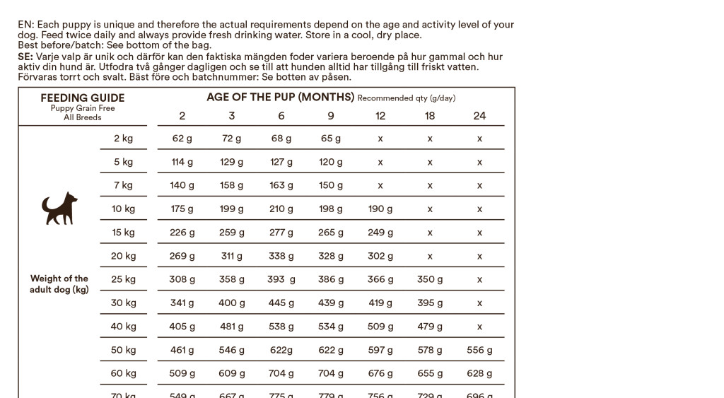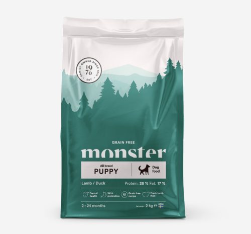 Összetétel:Friss bárány (25%), szárított kacsafehérje (14%), egész borsó, burgonyapehely, édesburgonya, szárított egész tojás (5,2%), heringliszt (4,4%), hidrolizált bárányfehérje (4%), sertészsír (3,8%), szárított répapehely, szárított sörélesztő, szárított alma, halolaj (0,56%), lenmag, szárított sárgarépa, szárított cikóriagyökér (a természetes inulin és frukto-oligoszacharidok forrása), nátrium-hexametafoszfát (0,34%*), krillliszt (0,25%), mannan-oligoszacharidok (0,15%), szárított brokkoli, szárított spenót, szárított vörösáfonya, szárított áfonya, szárított spirulina, glükózamin (100 mg/kg), kondroitin-szulfát (100 mg/kg), növényi kivonatok (Yucca schidigera, Macleaya cordata, Rosmarinus sp., Vitis sp., Curcuma sp., Citrus sp., Eugenia sp.).*Fogkőlerakódást csökkentő ásványi anyag. Analitikai összetevők:Nyersfehérje: 28%Nyerszsír: 17%Nyershamu: 7,9%Nyersrost: 3,1%Kalcium: 1,3%Foszfor: 1%Omega-6 zsírsavak: 2,1%Omega-3 zsírsavak: 0,58%DHA: 0,18%EPA: 0,16%Nedvességtartalom: 9%Energiatartalom: 3813 kcal/kg Táplálékkiegészítők / kg:Vitaminok: A-vitamin 15 000 NE, D3-vitamin 1 500 NE, E-vitamin 101 mg.Aminosavak: Taurin 1 000 mg.Nyomelemek: Vas (vas-szulfát-monohidrát) 50 mg, réz (réz-szulfát-pentahidrát) 10 mg, cink (cink-szulfát-monohidrát) 62,5 mg, mangán (mangán-szulfát-monohidrát) 10 mg, jód (kalcium-jodát) 1,5 mg, szelén (nátrium-szelenit) 0,20 mg.Kötőanyagok: bentonit 1 000 mg, szepiolitt 350 mg.Bélflóra-stabilizátor: Enterococcus faecium NCIMB 10415 10⁹ cfu.Antioxidánsok: természetes tokoferol-kivonat növényi olajból. Etetési útmutató:Minden kölyökkutya egyedi – az adagolás függ a korától, méretétől és aktivitási szintjétől. Etess naponta kétszer, és mindig biztosíts friss ivóvizet. Tárold hűvös, száraz helyen. Monster – a jó táplálás az egészséges, boldog élet alapja.